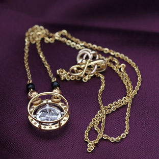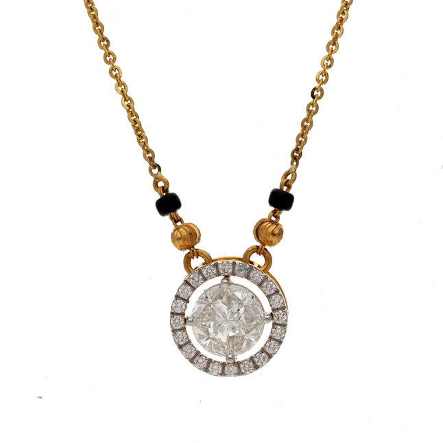 Minimal yet meaningful, our Double Circle Halo Mangal Sutra Pendant is a subtle celebration of marriage. The outer circle shines with diamonds, embracing a sizable circular diamond at its heart. Two black beads symbolize matrimony, with a solitaire setting for daily wear. Embody the essence of marital bliss in a chic, understated manner, proudly flaunting your commitment with every graceful movement.
